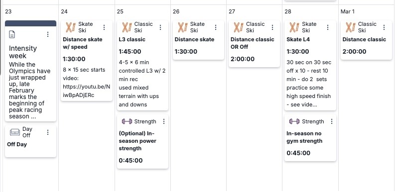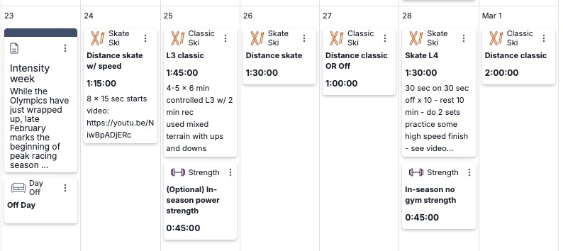 The Physiology of Peaking by Sarah Willis PhD. and use high quality sessions this week to refine your speed on skis. On the junior plan this week is designed to be a Junior Nationals build week!