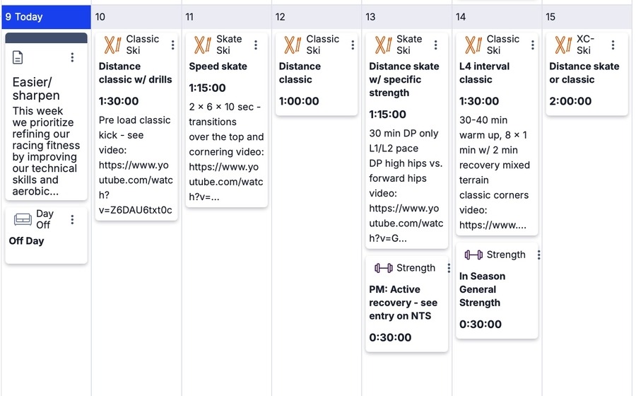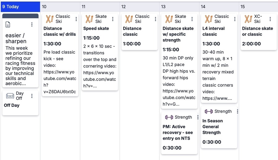 This week we prioritize refining our racing fitness by improving our technical skills and aerobic capacity. Are you done racing for the season? Read Andy's March training tips for ideas on how to continually improve and stay motivated this spring. This week we look at some more advanced technical drills and workouts. Check out Pre-loading Classic Kick video and our video outlining forward hip vs. high hip positions in double pole.