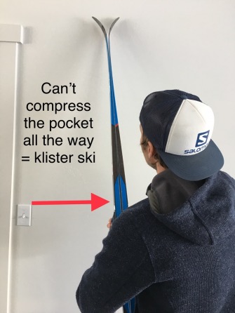 You’ve probably seen pictures of people squeezing together a pair of skis to look at the pocket. We do this by holding the skis at the bindings and pressing together to see how the wax pocket closes. Why do we do this? It’s a way of seeing how stiff the wax pocket is but more importantly how much residual camber is under the foot. Residual camber = the final compression of the wax pocket when under full body weight i.e. when you are kicking the ski. The amount of force it takes to completely close the last bit of a wax pocket will determine whether a ski is suitable for klister or dry-wax.