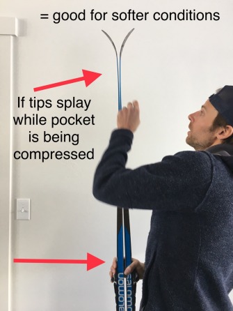 Skis that have more base contact while under a slight squeeze will be better in soft conditions. Furthermore, if the ski tips slay apart while the pocket is being compressed it’s another indication that the ski will be faster and ‘float’ better in soft conditions.