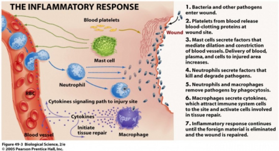 The damaged tissue releases chemical mediators such as Histamine, Bradykinin and Serotonin. These have the effect of increasing local capillary flow and venous wall permeability which in turn allows fluids and free proteins (resultant of damage) to “leak” into adjacent tissues. This causes the noted “swelling” we recognize post injury. Mediators also assist with coagulation of material and subsequent “walling off” of the inflammatory site, preventing expansion into neighboring healthy tissue. Lastly the mediators signal the influx of Macrophages (short duration cells/hours days) and Neutrophils (long acting cells/days weeks) to the area which kill any invading bacteria and begin the “digestive“ process of ridding the area of dysfunctional cells. This paves the way for the influx of “Colony Substances” to start regeneration (Guyton. Textbook of Medical Physiology. W.B.Saunders Comp. 6thEdi, 1981).