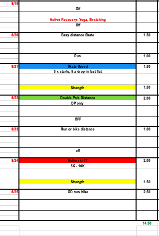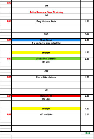 This week we recommend another hybrid style training week. One that focuses on recovery, particularly in the beginning of the week, since we have been in a good two week block of solid training. After a little break from volume and intensity we recommend a time trial or race effort on the weekend. We are transitioning into a phase of more intensity and there is no better way to log quality L4 than drying a race! If there is a rollerski time trial available that's great! A running time trial or 3,000 can work too but I recommend a more ski specific mode when possible along with a 'ski race appropriate' distance.