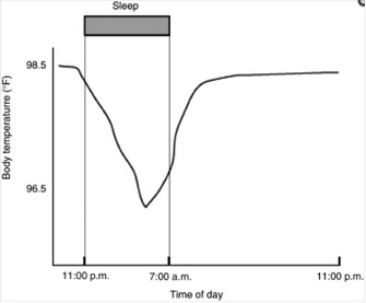 Let’s zoom in on body thermoregulation, as we said above that there is a decline in night body temperature. This is accompanied by decreased heat production and increased heat loss (which promotes sleep onset and maintenance). Body temperature gradually increases in the hours before waking as the brain signals to increase heat production and conservation to disrupt sleep and promote waking. Look at the image below to visualize this response.