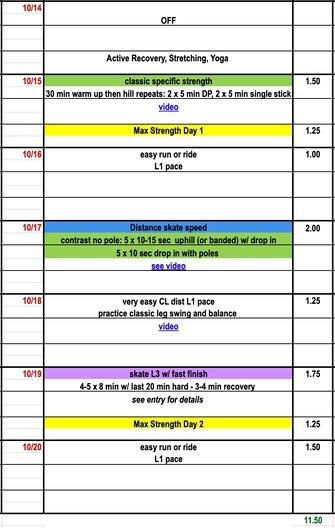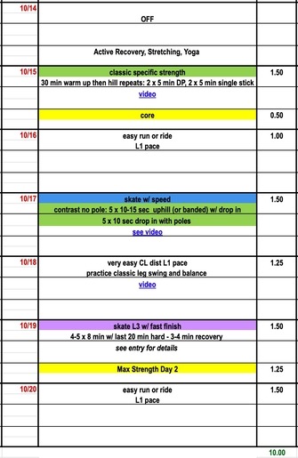 This week we reduce total training volume as we shift our focus toward more high intensity sessions this month. In a year long training cycle it's common to focus on intensity in October, then build up more easy distance training hours in November as we transition to snow.