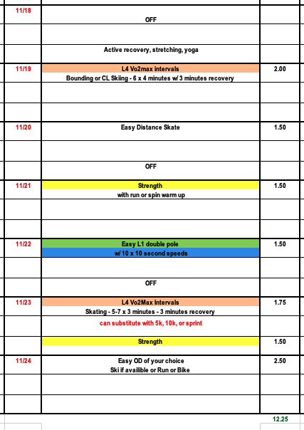 - Just like with any intensity week make sure to keep the easy days easy! That means an easy pace on L1 distance skiing