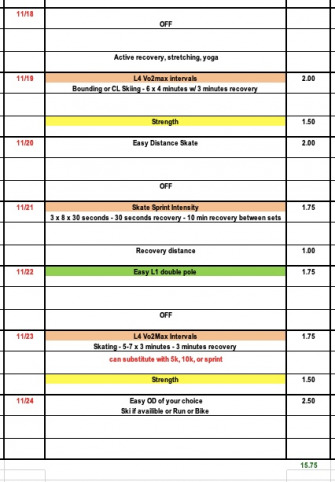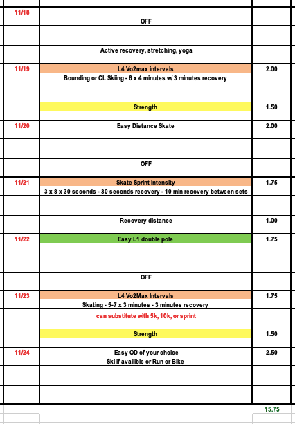 Time for some final interval prep before the season begins! Even if you are not racing at all in late November or early December this periodization will help build your fitness leading into the winter. Any time we can work on intensity followed by a higher volume week we are more apt to absorb that training.