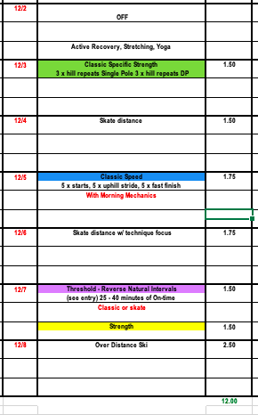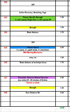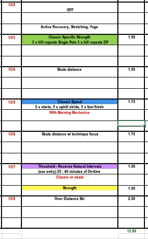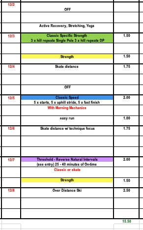 Hopefully many of you were able to ski on snow during Thanksgiving week and get used to the subtle differences between snow skiing and rollerskiing. With higher volume last week we want to use the beginning of this week to make sure we feel recovered