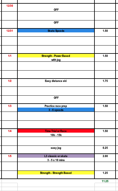 This week hundreds of skiers from around the country will be competing at the US Nationals in Houghton, Michigan. Even for those who are not, I wanted to draft the general NTS plan to reflect a race series to showcase a few important aspects of a big race week. Notice the high frequency of short training (this is used to help the body feel good and recover) as well as race prep recommendations. This week's plan can be adjusted for any elite skier who is not doing 3 races this week.