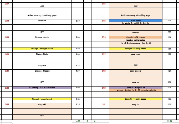 The JN prep plan will be different than the Birkie plan in a few ways. First, most juniors have been steadily competing in qualifiers and weekend races throughout January and February. In a sense this was the 'intensity block' that we featured in the Birkie plan. From here we will recommend a slight increase in volume followed by a short taper phase.