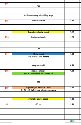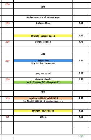 So what should you do for training after a big marathon? Our masters plan this week is a good example. Active recovery is very beneficial for skiers looking to bounce back quickly from a big race week. Notice how we recommend a longer distance recovery ski on Tuesday and then an additional off day for recovery rather than two off days in a row.