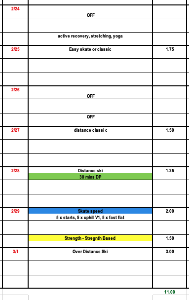 In week 44 our Masters and Junior plans are very different. On the master's side we will focus on recovery, especially for those who have just finished the Birkie. Those of you who did not race the Birkie and are preparing for World Masters make sure to check out the entry by Betsy and Bob Youngman. Skiers preparing for World Masters can feel free to reach out to me or Betsy and Bob for race preparation guidance.