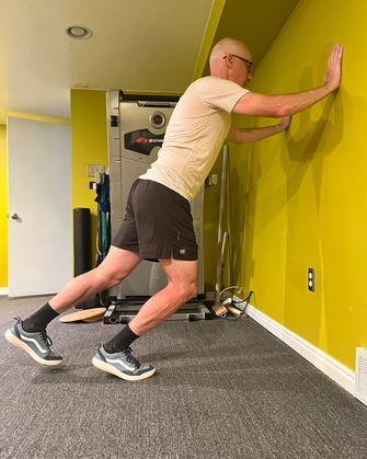 Less specific to diagonal striding but still a good warm-up is swinging the leg side to side. Same set up and cues, except the leg is going to the side and then across the body. Spine control is about preventing side bending, especially as the leg goes out to the side.