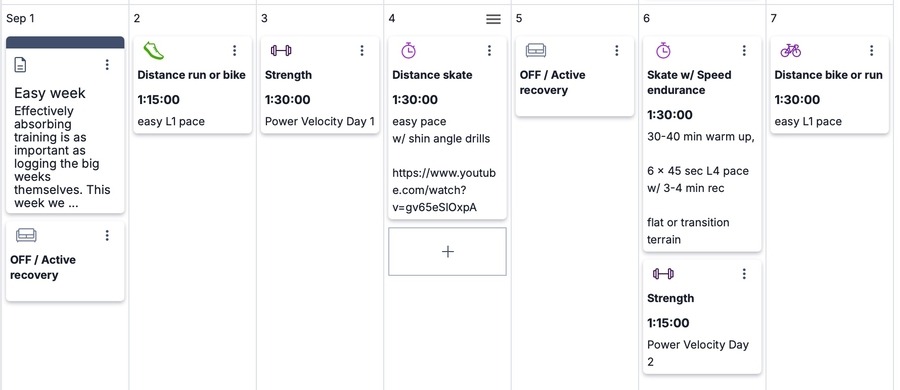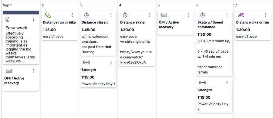 Effectively absorbing training is as important as logging the big weeks themselves. This week we reduce training volume and intensity to give our bodies some much needed rest. This recovery week is particularly important since it also marks the transition from our base training to fall preparation phases. We start a new 4-week strength plan this week that focuses on power-velocity and prioritize rest and technique work. Make sure to check out Ned Dowlings new post on diagonal hip extension to learn how to stride with better muscle recruitment and efficiency.