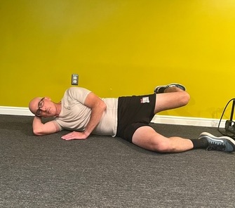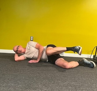 Now move the top leg forward and backwards making sure the motion is isolated at the hip. You can put a hand on your pelvis to monitor for movement (motion at the pelvis=motion at the spine=no good).