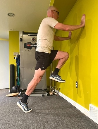 Less specific to diagonal striding but still a good warm-up is swinging the leg side to side. Same set up and cues, except the leg is going to the side and then across the body. Spine control is about preventing side bending, especially as the leg goes out to the side.
