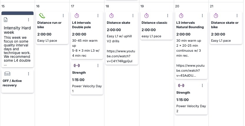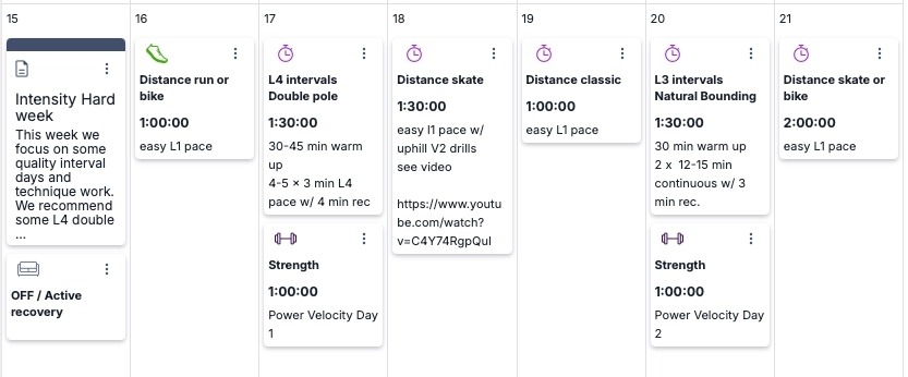 This week we focus on some quality interval days and technique work. We recommend some L4 double poling or erging to help increase our power and aerobic capacity. Natural bounding is one of our favorite fall training methods, Check out this week's video on natural L3 intervals. Can you use your upper body more effectively in V2? We recommend some useful drills to try in your next session.