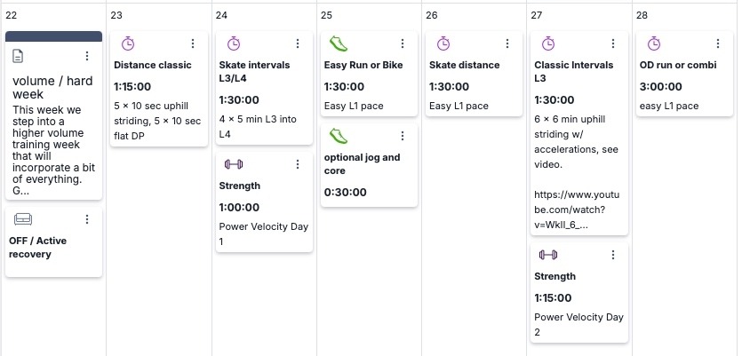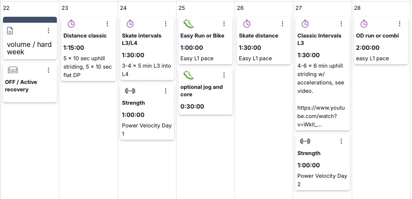 This week we step into a higher volume training week that will incorporate a bit of everything. Go-to fall training for skiers! You'll notice we recommend both L3 and some sort of L4 each week. This L4 might come in the form of speed endurance training (short intervals) or Vo2Max building sessions. Check out Dr. Sarah Willis' entry on Why We Train Different Intensities and our video outlining L3 intervals with transition speeds. A great session to build confidence before winter. Plus, Ned Dowling teaches us how to understand pain in the body, and we wrap our final week of power velocity strength.