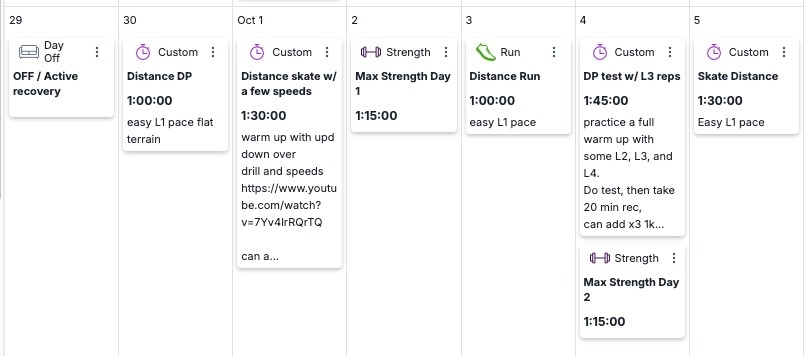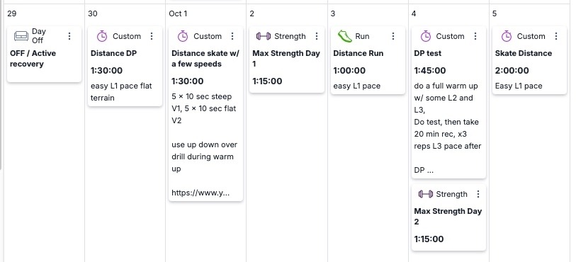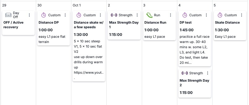 This week we return to easier training and an important recovery week before we ramp up more fall intensity and volume. We introduce our second phase of max strength training for junior, masters, and Elite. (Junior athletes and coaches please use common sense and caution when determining if max strength is appropriate for you. Our brief guidelines are referenced in the plans). Check out our Up Down Over drill to help with skating weight transfer and test yourself this week with a double pole test on rollerskis or SkiErg.