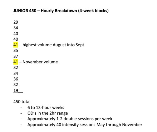 There is a 100 hour difference in volume between these plans 450, 550, 650. If you feel like your hourly training goal falls above or below this recommendation simply adjust the weekly hours accordingly. A skier's yearly target goal might depend on their schedule and development. For junior skiers who have been on a consistent path of development we recommend approximately a 50 hour increase from the year before.