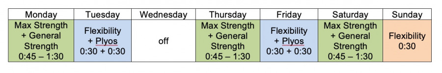 Similar to the Max Strength/General Strength modality, plyometrics are most effective at two sessions per week with advanced athletes moving toward three sessions per week. Here is an example of a typical week of strength training for a committed, competitive athlete to be completed in addition to cardiovascular training elements: