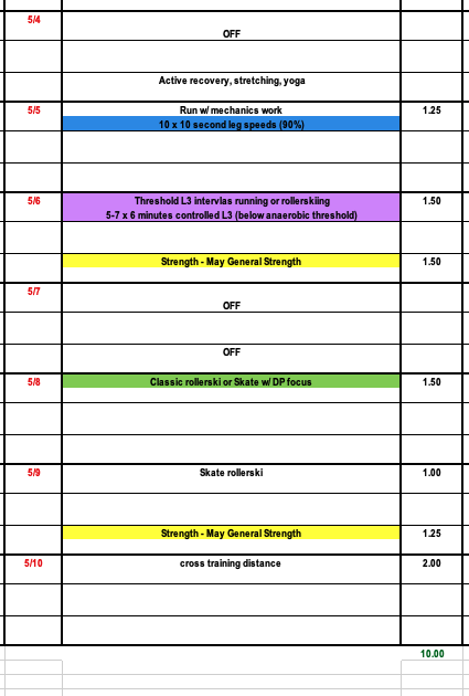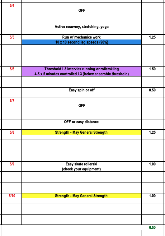Week two is a fairly straight forward plan for Junior, Master, and Elite. We recommend some more dynamic foot work to start off the week. Check out both running mechanics videos to try some new drills and incorporate some leg speeds as part of this workout. This week's intensity session will focus on controlled L3, and we continue with two general strength workouts.