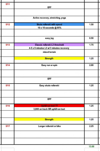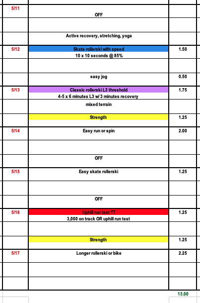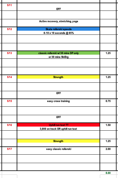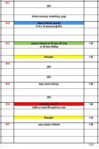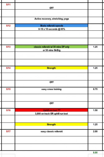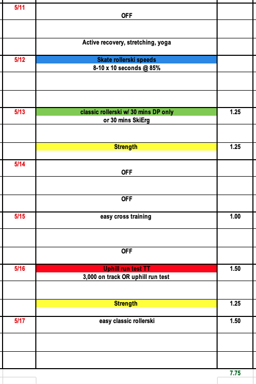The Junior, Master, and Elite plans will all recommend a running test this week! By now we should have done enough cross training to get our legs ready for a short hard effort. We use running tests like this to help monitor aerobic capacity throughout the prep-period so May is a great time to set a baseline test. (We will post our new strength testing protocol next week)