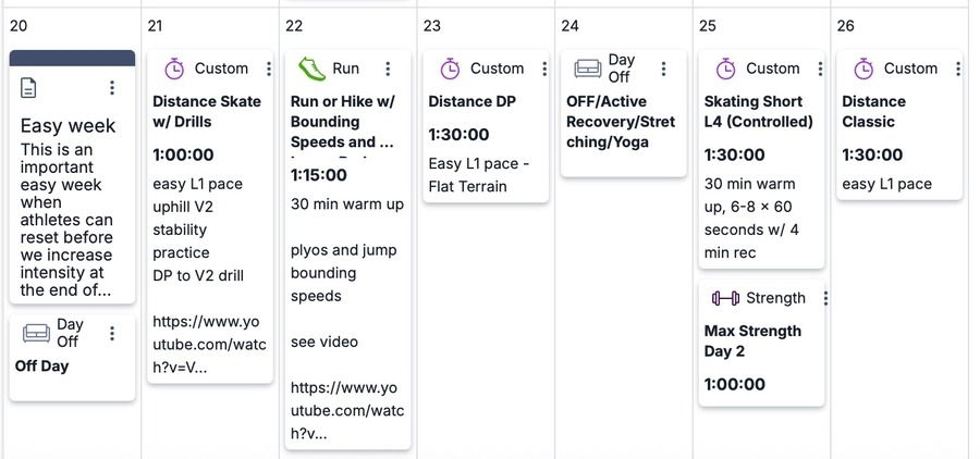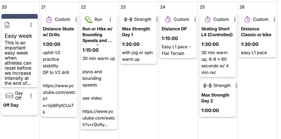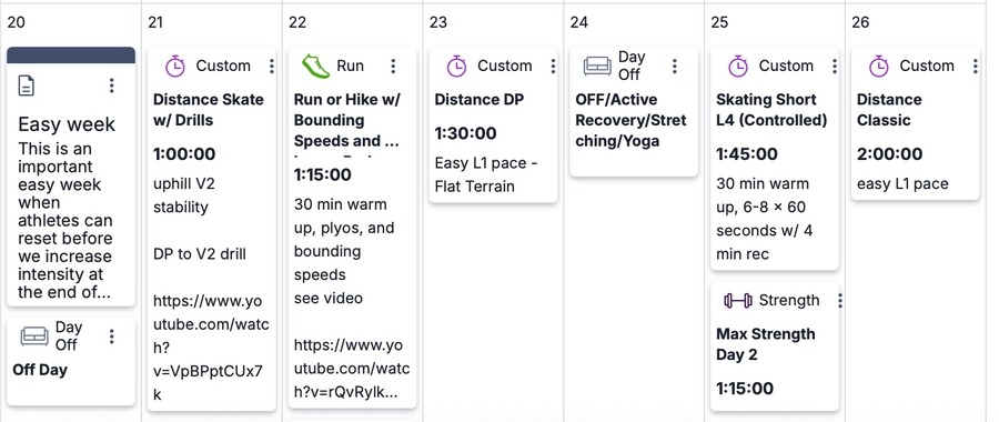 This is an important easy week when athletes can reset before we increase intensity at the end of October. Spend some time during an easy distance session this week to work on V2 technique with our DP to V2 drill. We recommend a lower body spenst workout to build power and muscular endurance that will transfer into ski speed in the weeks to come. What kind of fitness is needed to be an elite cross-country skier? Dr. Sarah Willis digs in and explains in her articleWhat We Know About Skiing PHYSIOLOGY.