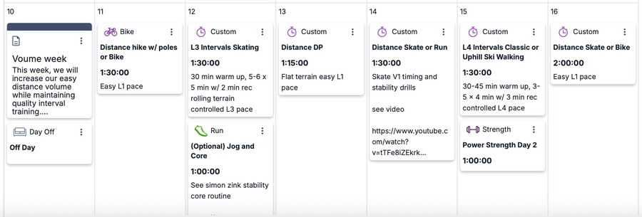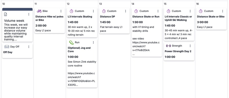 This week, we will increase our easy distance volume while maintaining quality interval training. During weeks like this, make sure to keep the easy days at an L1 as much as possible. Are you experiencing shoulder season conditions in your area? Andy and Annika offer some fall training tips along with advice for high school and college cross-country runners transitioning to ski training.