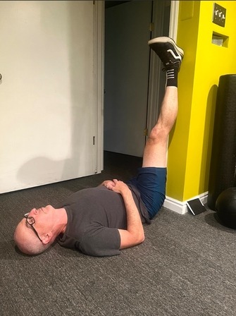 Lie on your back in a doorway with one leg on the ground and the other leg up the wall. Knees should be straight. The closer your butt is to the wall, the more intense the stretch. This position is a little awkward but allows for a low load, long duration stretch which tends to be the most effective for gaining flexibility. Hold for 3 minutes on each side.