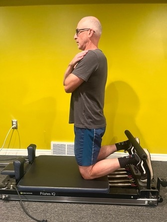 Stand with feet staggered and pointed straight ahead. Push your pelvis forward like someone is pulling you by your belt. Your front knee will bend a little as your weight shifts forward. It’s ok if the back heel comes off of the floor. Hold for 20 seconds. Repeat 2-3x on each side