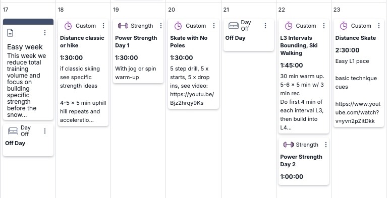 This week we reduce total training volume and focus on building specific strength before the snow piles up. If you are experiencing tough training conditions in your area, remember to be flexible with your workouts and replace rollerski sessions with easy on-snow tromping or foot workouts. Over the next few weeks we will prescribe rollerski session and often link rollerski videos, but all of these workout recommendations can be done on snow as well.
