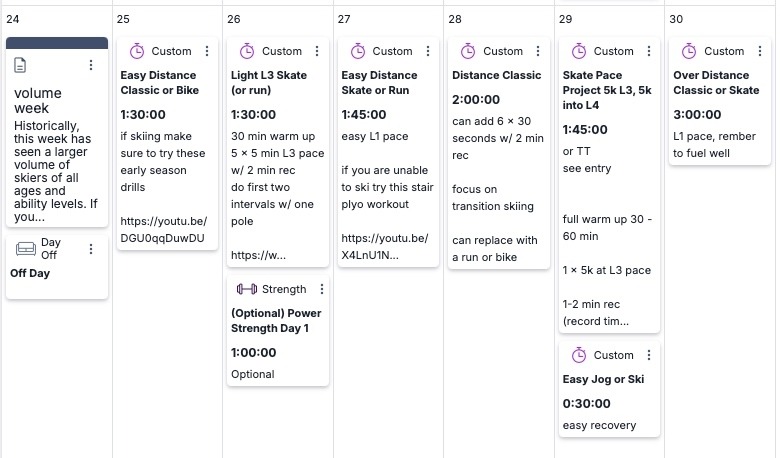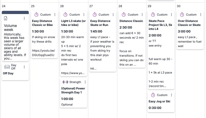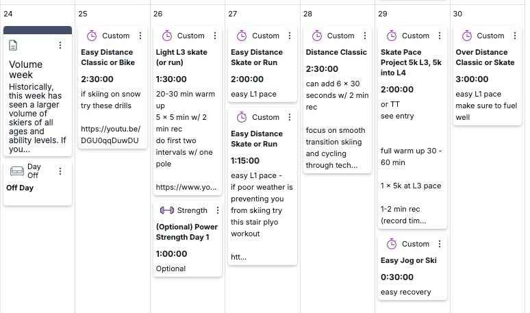 Historically, this week has seen a larger volume of skiers of all ages and ability levels. If you are skiing on snow, it's a great opportunity to log some easier Level 1 days on snow to increase your comfort level on skis. For dryland training, we can still focus on easy volume building but feel free to adjust the training modalities to suit your weather conditions. One-pole skiing and focused technique work are particularly beneficial during the first days on snow as well as on rollerskis. Remember, you can always replace rollerski and skiing recommendations with skierging, cycling, or hiking with poles.
