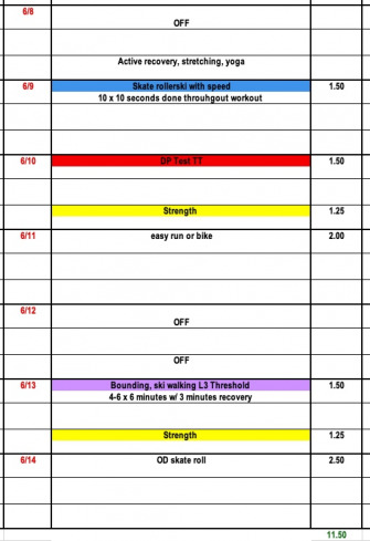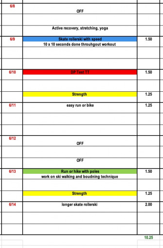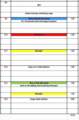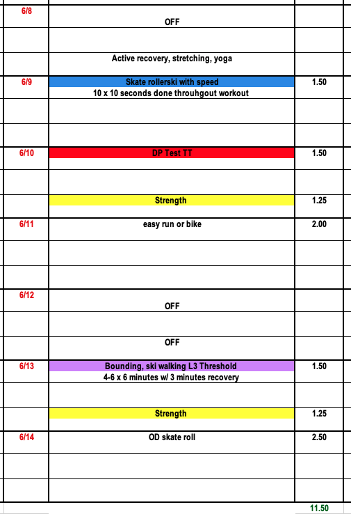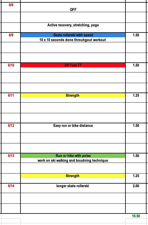 Week 7 is categorized as a 'test' week which will focus on high intensity early in the week. Incorporating some max effort or L4 intervals every two weeks in June is a good way to maintain aerobic capacity and also provide a great opportunity for testing. Feld tests are one of the best ways to monitor a skier's fitness in the off-season. (check out Double Pole Test Protocol for more info) This week's double pole test recommendation is appropriate for all ages, all abilities, skate skier or classic skier.