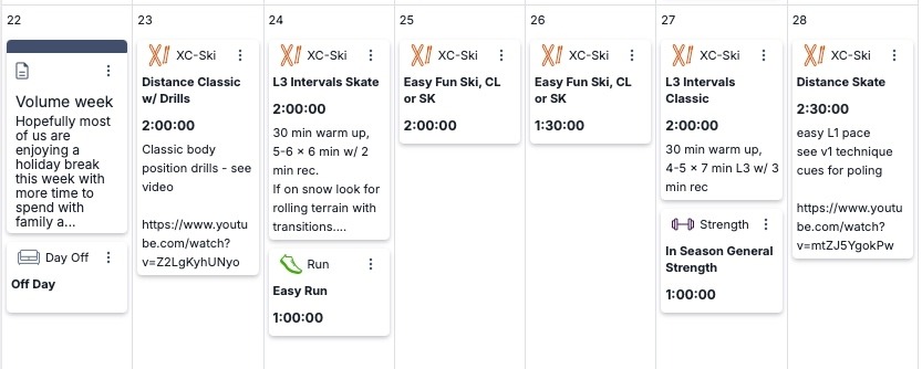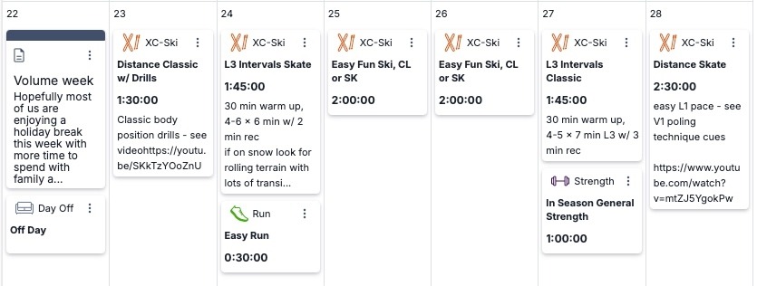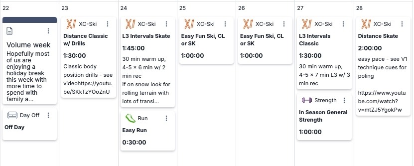 Hopefully most of us are enjoying a holiday break this week with more time to spend with family and on skis! While not everyone's schedule will allow for more training time, if you can put in some extra hours of easy distance training this week go for it! We recommend a volume based training week with technique drills and L3 intervals. Try our basic body position progression for classic skiing plus V2 inspiration from Klaebo and new V1 technique cues.
