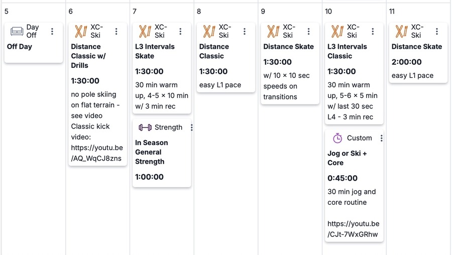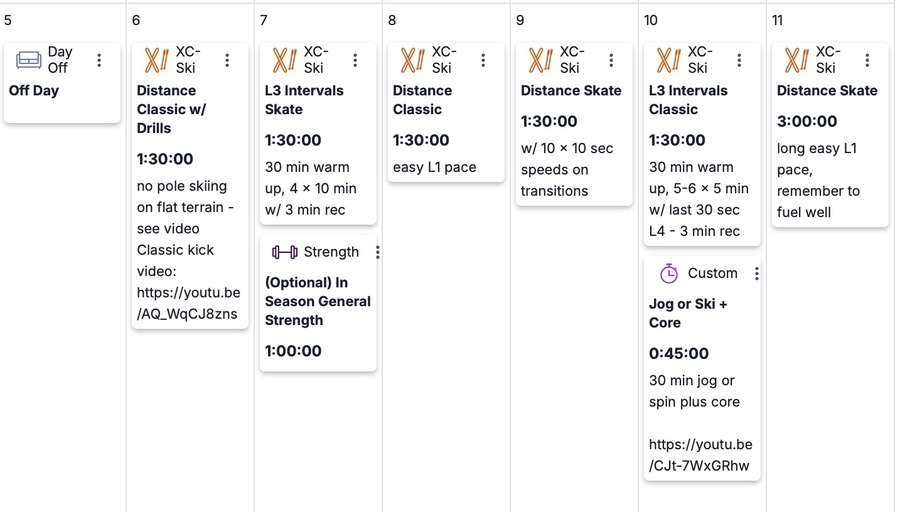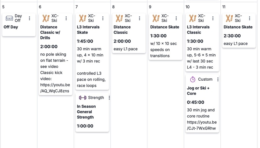 This week we build training volume and focus on L3 intervals and longer distance skiing. Remember, if you are racing local races, you can always replace the recommended interval sessions with races. Spend some time this week working on classic kick fundamentals, timing your kick correctly, and cornering technique.