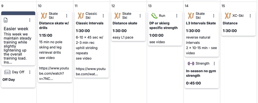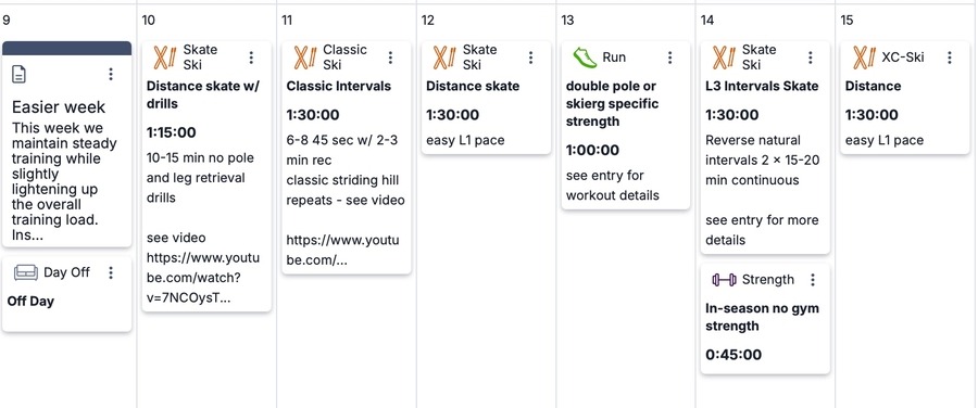 This week we maintain steady training while slightly lightening up the overall training load. Instead of two pure interval sessions this week check out our new uphill repeat workout for classic technique. We also recommend a natural interval session designed to help skiers dial in a consistent race pace. Distance session this week can all include some no pole skiing to work on balance and improve your comfort level on skis.