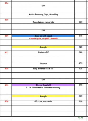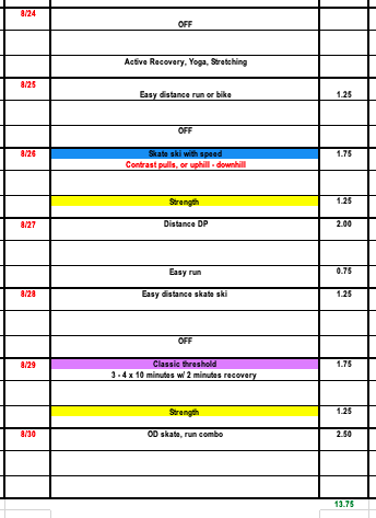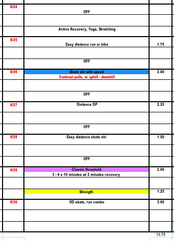 We continue with power based strength and transition into power based training on skis with weighted sled pulls. (if you do not have a sled you can also contrast uphill speeds and downhill)