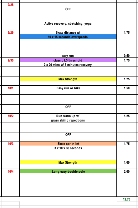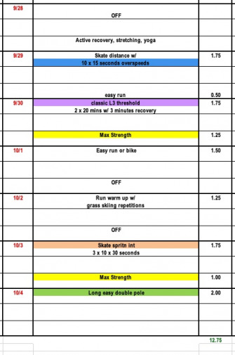 This week will offer a little bit of recovery while still prioritizing some high speed workouts. In general, we will spend the next 4 weeks focusing on higher intensity interval sessions (L4, TT's, with a little bit of L3) before our focus will shift back to threshold and volume in November.