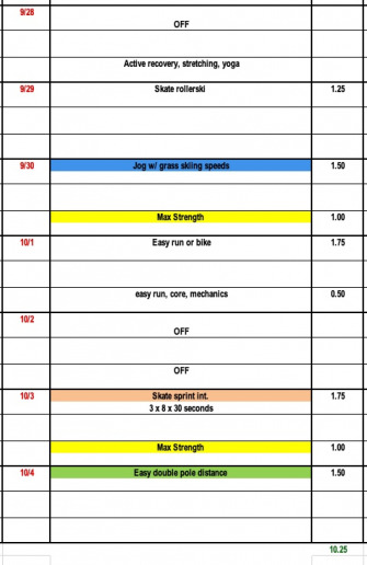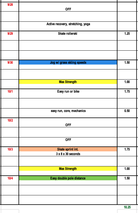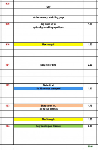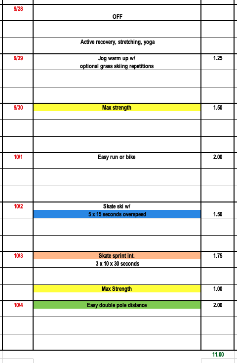 This week we recommend increasing the repetitions in our 30 second interval sets, we start our max strength phase two, incorperate some overspeed, and with the signs of snow on the mountain tops; why not some grass skiing??