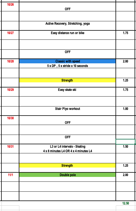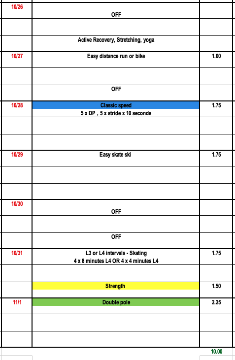 Following last week's testing and intensity this week we prioritize recovery and will evaluate how our testing efforts went and what we ned to do individually to reach our potential. Spend some time evaluating how you felt during last weeks hard sessions as well as review your training log.