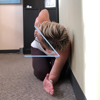 Begin by kneeling next to a wall, and go into child’s pose with the glutes on the heels. Place the forearm closest to the wall on the ground between your knees. Place the other hand behind your back. Keeping your glutes on your heels, rotate upwards towards the hand on your back.