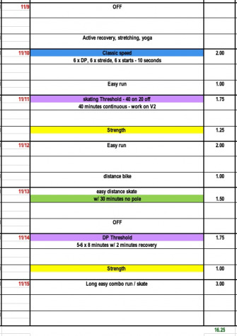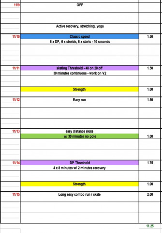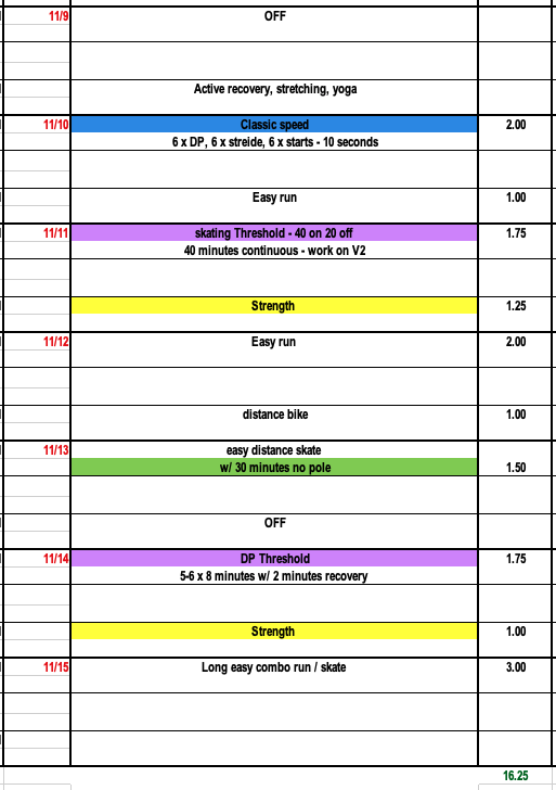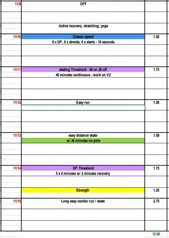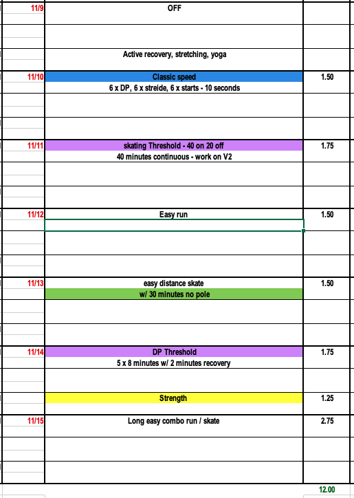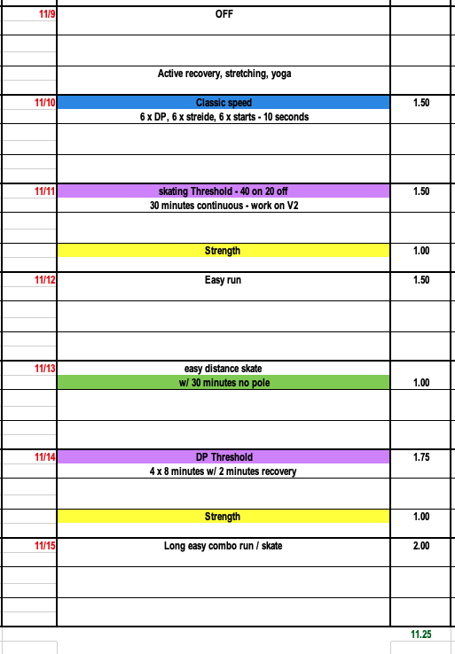 40 on 20 off which we recommend early in the week. Prioritize L1 and technique work on the easy distance days and challenge yourself with new on-time PR's during Saturdays threshold session. With volume being the focus for November Sunday's OD should be long and easy.
