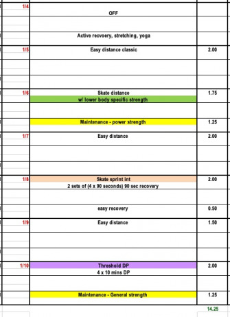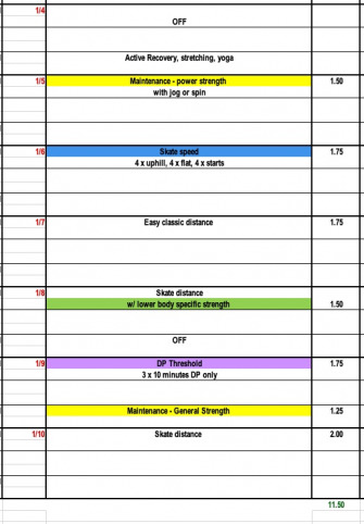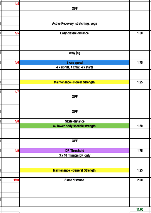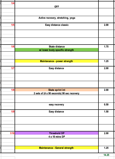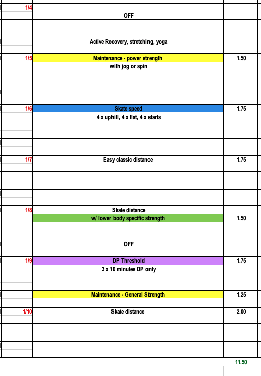 This week we return to some easier workouts to start off the week after a tough double-header race (or TT) weekend. During with winter it can be easy to forget about specific strength so this week our focus on both lower body and upper body on-snow strength development. We do this with a no-pole lower body skate specific strength session and L3 double pole intervals on the weekend. Both are great opportunities to build efficiency and work on technique at the same time. We also start our winter strength routines which can be adjusted to suit the focus of the week. Without any races or TT's planned we prioritize power and general strength.