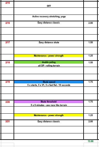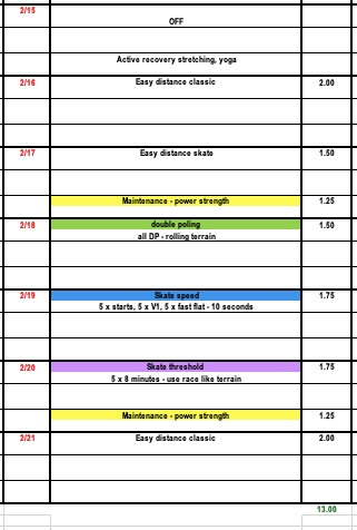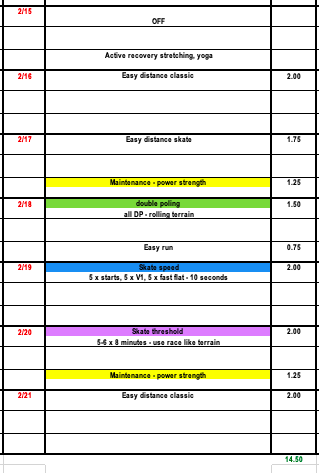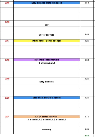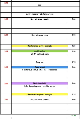 Our general training plans continue to move in different directions this week. On the masters side we continue with a pre-Birkie taper while incorporating some good sharpening interval sessions and speed. Note that on the masters plan we have pushed the off day to Tuesday in preparation for the Birkie next week.