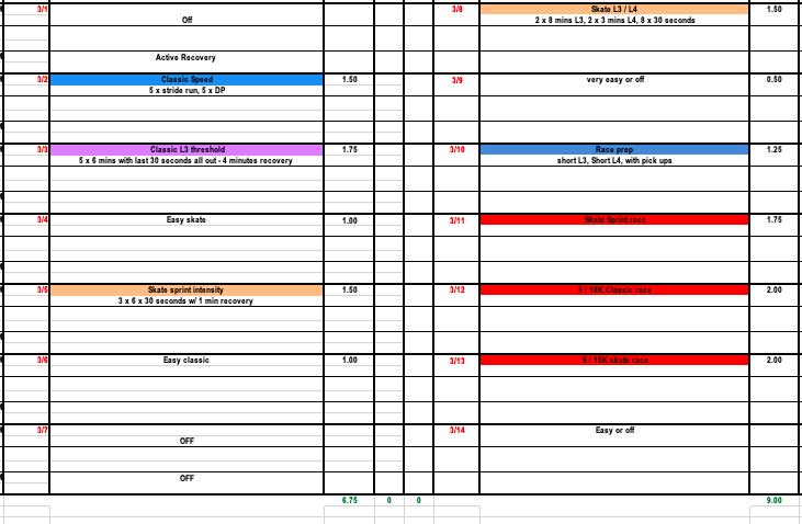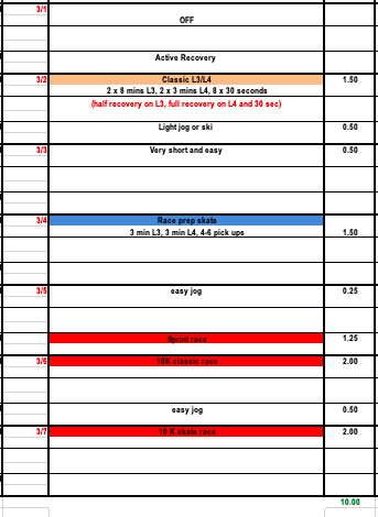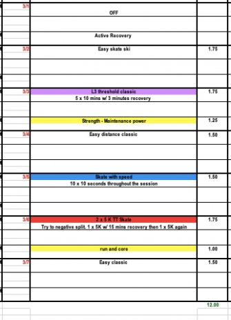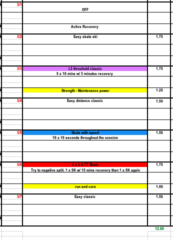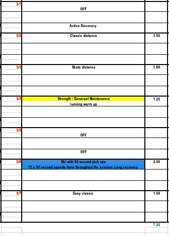 Congratulations to all the Birkie competitors and virtual competitors! This week you deserve some well earned rest. We do however want to continue to workout so our bodies don't go into hibernation mode. We recommend some steady but short easy distance training, one strength session, and a ski with 30 second pick ups later in the week .
