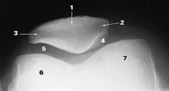The “retro patellar” (under) surface has a central prominence or ridge, designed to “track” within the central groove created by the two femoral condyles (6 and 7). The patellar under surface is also divided into 4 articular “facets” (medial 4, lateral 3, central, odd 2). Each facet has a range of motion dictated role in absorbing compressive loads as it operates as a pulley. The lateral facet absorbs load in extension of the knee, and correspondingly the medial and odd facets during flexion. Compressive loads between the femur and patella can be enormous, often hundreds of pounds (Cohen et al, Amer J Sports Med, 29 (4), 2001 and Powers et al, J Ortho Sports Phys Ther, 44, 2014). To accommodate these loads, the “retro-patellar” articular cartilage is the thickest in the body, approaching 7mm along the central ridge (Ahmed et al, J Orthop Res, 1987). Despite the durability of the patella, surface lesions do occur and unfortunately the hypo- vascular nature of articular cartilage restricts healing once damaged.
