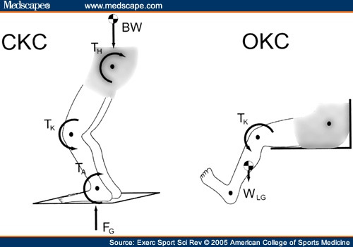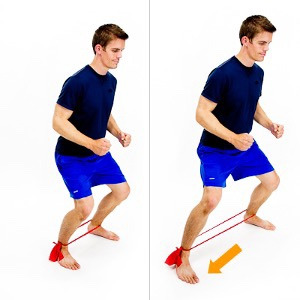 Closed kinetic chain (CKC ) exercises are introduced after the OKC phase if the athlete is improving. They are also initiated isometrically using body weight plus some form of external resistance. Placing exercise bands around the knees “cues” the athlete to activate the gluteal region and limit preloading of the infrapatellar zone. The same parameters are followed for CKC as the OKC work.