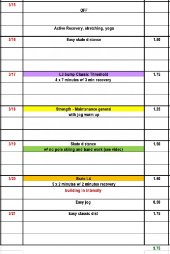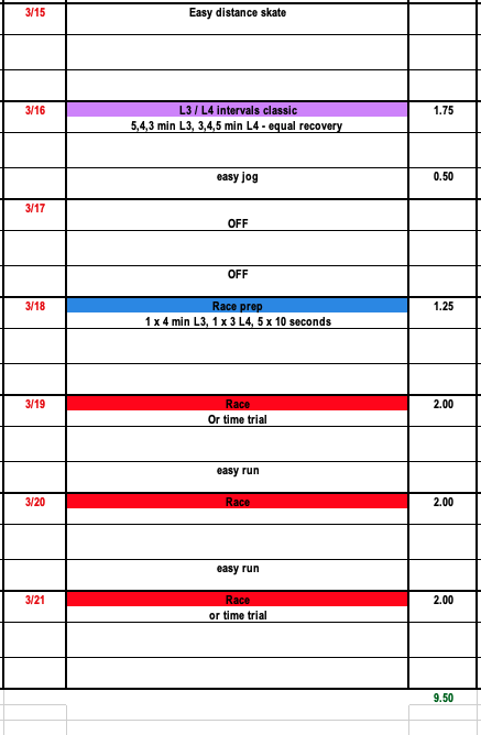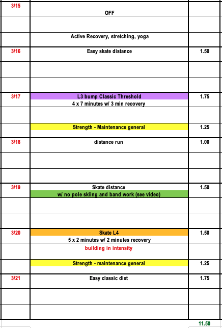 Training this week might look different depending on whether or not you have more competitions scheduled this season. Like we discussed last year at this time, even if skiers are done competing it's still important that they continue to work on race fitness and technique through the month of March if ski conditions allow. This will allow athletes to bridge their fitness from one training season to the next. Rest and time off is important, but as long as skiers are feeling healthy and able, that time off is better served in April.