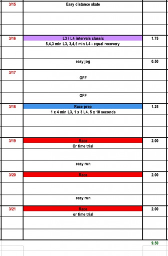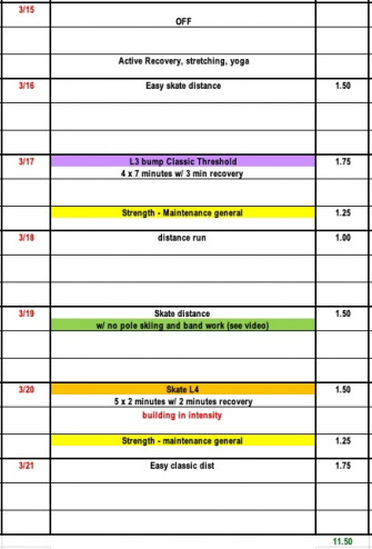 This week the Junior and Masters plans are designed for the non-racers. This week we incorporate an L3-bumb session to help extend fitness into the spring. On the Elite side we have built the plan around finial FIS race weekends across the country. If you are an elite racer who is not competing it would be a good idea to do some TT's this weekend.