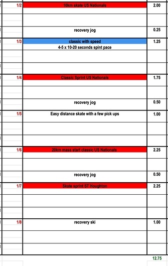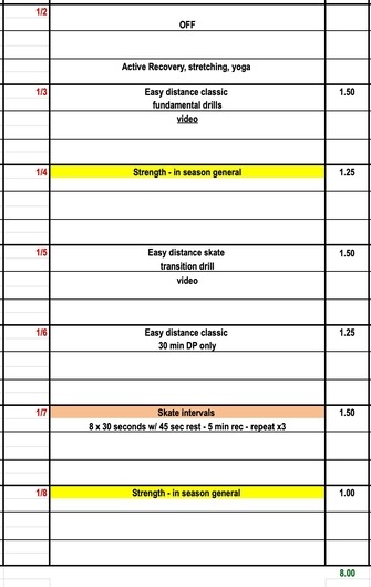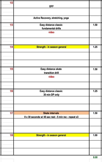 After two weeks of higher volume, this week we focus on technique, slightly reduced hours, and short intervals. Check out our new Skate Transitions video for a fun way to train smooth transitions from V2 to V1. Both the junior and master plans will incorporate one 30 second sprint intensity and two strength sessions to help build and maintain mid winter strength. The elite plan follows the US National competition in Houghton, MI and focuses on recovery and health (see A Healthy Immune System for skiers)